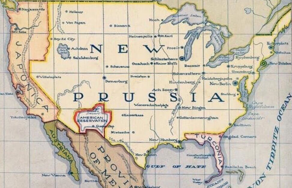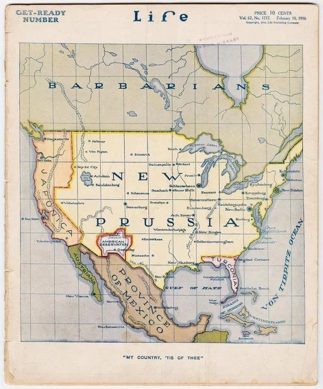 This map appeared on the cover of Life Magazine on February 10, 1916. It was part of the effort of American internationalists to overcome isolationist sentiment insisting on continued neutrality in the ongoing European War. The U.S. has been renamed New Prussia, and American city names have been replaced with German (or Germanized) versions. Washington is New Berlin, Chicago is Schlauterhaus, and Boston is Kulturplatz. Denverburg and Salzlakenburg are presumably German, but Florida has become Turconia, California is Japonica, and the northwest is dominated by Nagaseattle and New Kobe. New Mexico is an “American Reservation” in Der Grosse Desert.