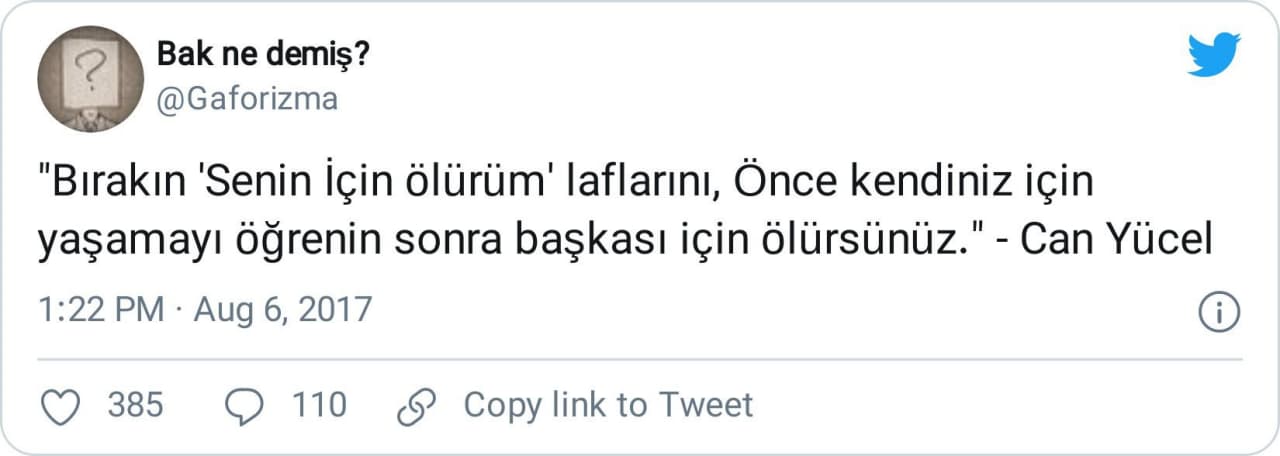 Mevzubahis söz, sosyal medya sitelerinde Can Yücel’e de (“Bırakın ‘Senin İçin ölürüm’ laflarını, Önce kendiniz için yaşamayı öğrenin sonra başkası için ölürsünüz.” biçiminde) izafe ediliyor: