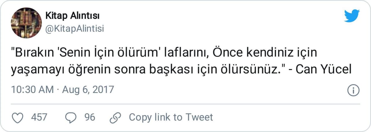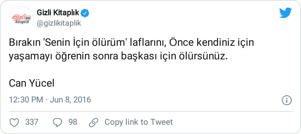 Öyle ki yukarıda, sözü Turgur Uyar’a ait zannedip paylaşan kullanıcılardan bahsederken örnek verdiğimiz Gizli Kitaplık isimli Twitter profili, kafası hayli karışmış olacak, bir hafta arayla aynı sözü bu kez Can Yücel’e isnat etmiş: