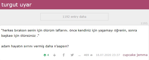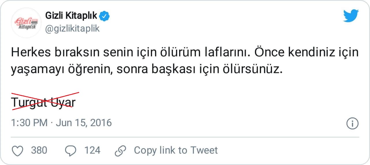 Turgut Uyar’a (4 Ağustos 1927 – 22 Ağustos 1985) atfedilen “Herkes bıraksın senin için ölürüm laflarını. Önce kendiniz için yaşamayı öğrenin, sonra başkası için ölürsünüz” şeklindeki sözün, çeşitli mecralarda şairin imzasıyla dolaştığına şahit oluyoruz:
