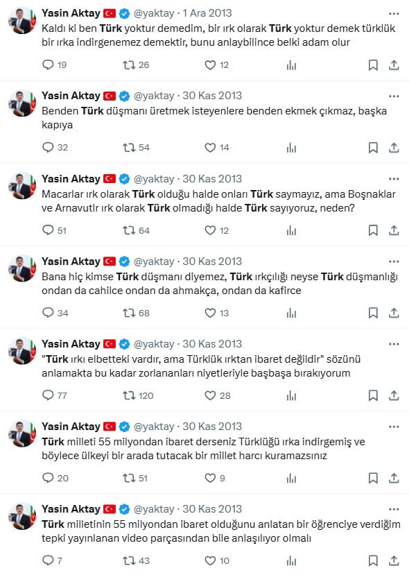 Eski AK Parti Milletvekili, AK Parti Merkez Karar Yönetim Kurulu Üyesi ve Yeni Şafak yazarı Yasin Aktay’ın “Türk diye bir ırk yoktur” söylemi sosyal medya platformlarında yeniden gündeme geldi.