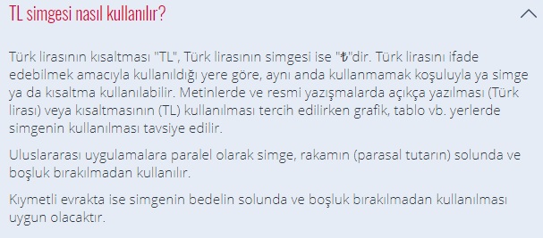 Türk lirası sembolüne (₺), yaygın kullanımın aksine para tutarının sağında değil solunda boşluk bırakılmadan yer verilmesi gerekiyor.