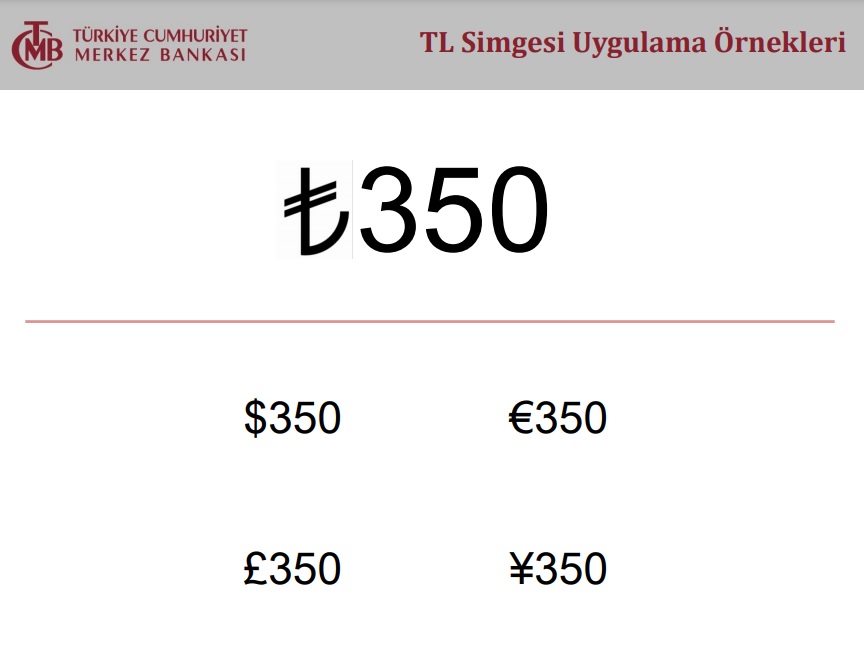 Örneğin, 350 Türk lirası tutarındaki bir ürün için TL simgesi kullanılacaksa doğru kullanım 350₺ değil ₺350 şeklindedir.