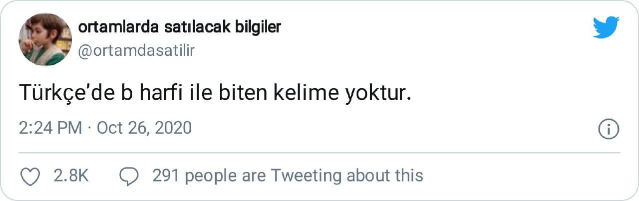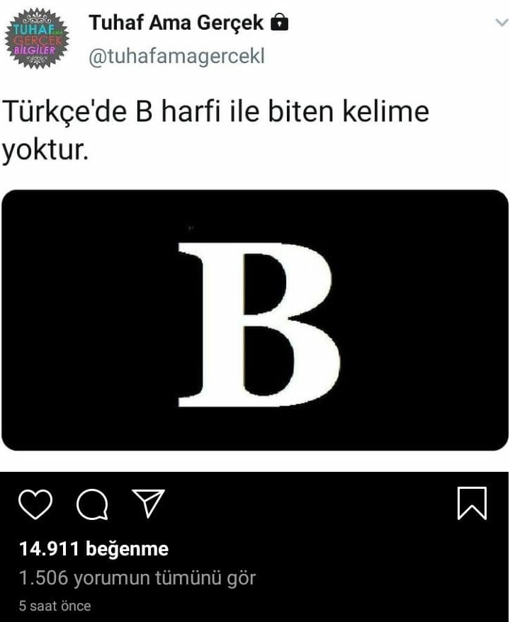 Sosyal medyada bu Türkçede b harfiyle sona eren kelimenin olmadığını öne süren paylaşımlardan bazı örnekler sunalım: