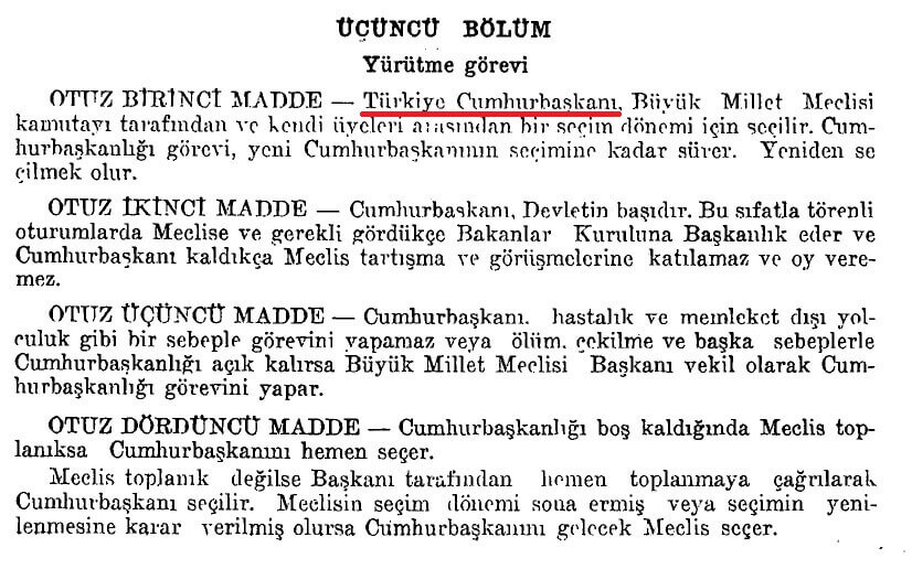 Türkiye Cumhuriyeti Anayasası‘nın “yürütme erki” hakkındaki güncel hükmü (16 Nisan 2017 tarihli 6771 sayılı Kanun’un 16. maddesi ile yapılan değişiklikle birlikte) “Yürütme yetkisi ve görevi” başlıklı 8. maddesinde “Yürütme yetkisi ve görevi, Cumhurbaşkanı tarafından, Anayasaya ve kanunlara uygun olarak kullanılır ve yerine getirilir” şeklindedir. Ancak, 15 Ocak 1945 tarihinde Resmî Gazete’de yayımlanan 1924 Anayasası‘nın Türkçeleştirilmiş halinde da bu madde “Türkiye Cumhurbaşkanı, Büyük Millet Meclisi kamutayı tarafından ve kendi üyeleri arasından bir seçim dönemi için seçilir. Cumhurbaşkanlığı görevi, yeni Cumhurbaşkanının seçimine kadar sürer. Yeniden seçilmek olur.” şeklinde idi.