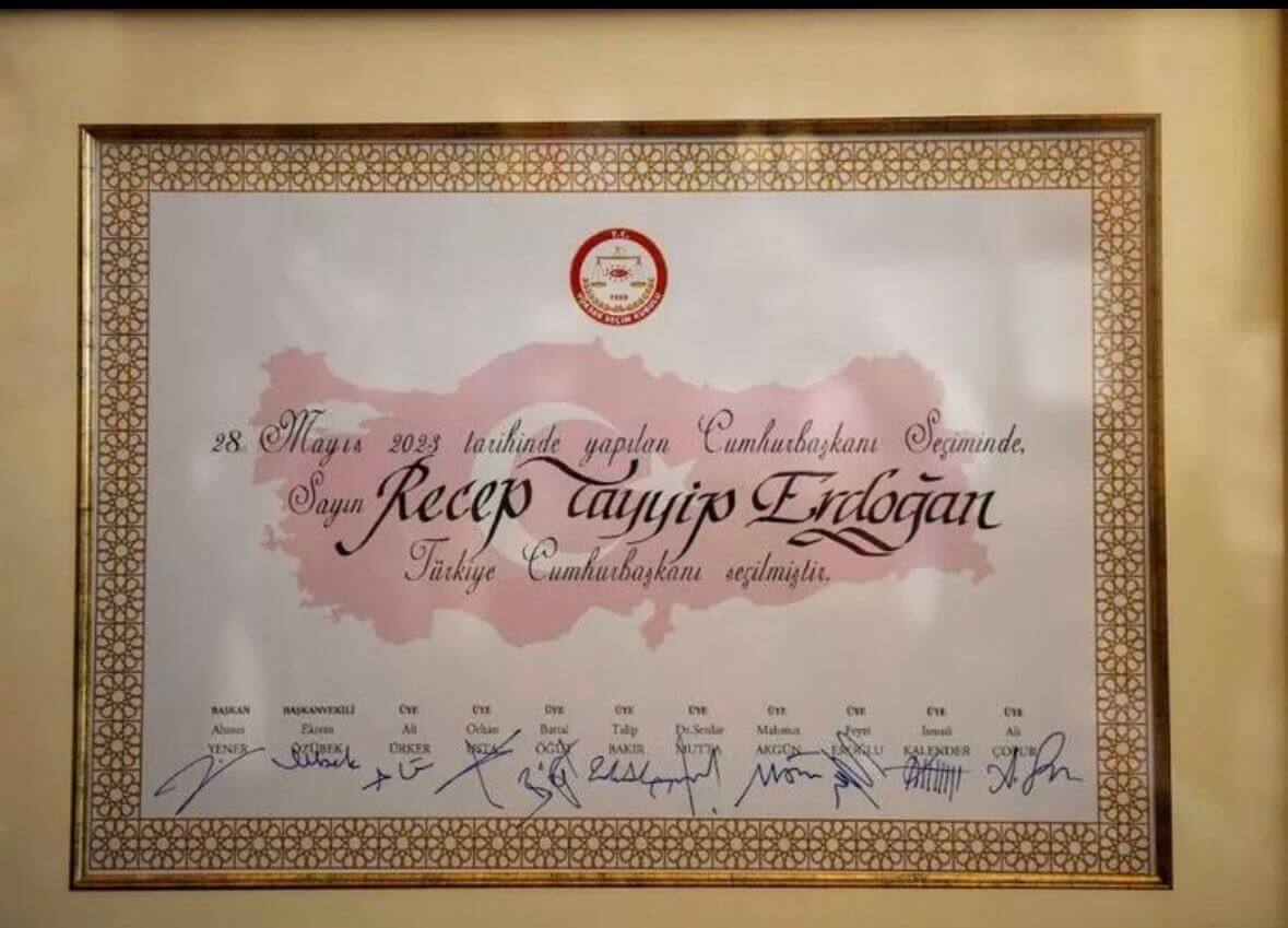 Mazbatada geçen cümle “28 Mayıs 2023 tarihinde yapılan Cumhurbaşkanı Seçiminde Sayın Recep Tayyip Erdoğan Türkiye Cumhurbaşkanı seçilmiştir.” şeklinde idi.