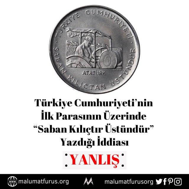 Türkiye Cumhuriyeti’nin ilk madeni parasının üzerinde “saban kılıçtan üstündür” yazdığı iddiasıyla sosyal medyada paylaşılan bir görsel dikkatimizi çekti.