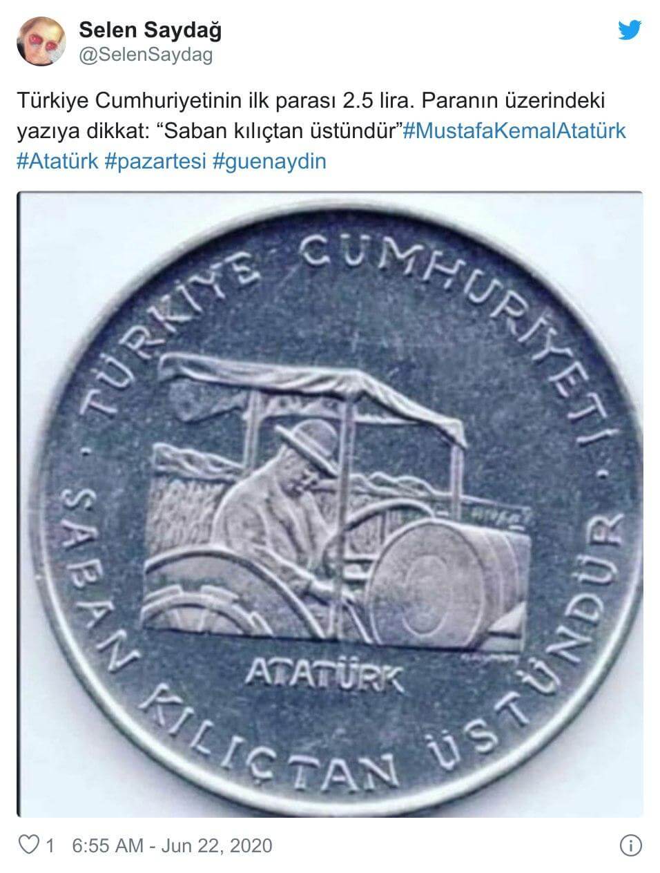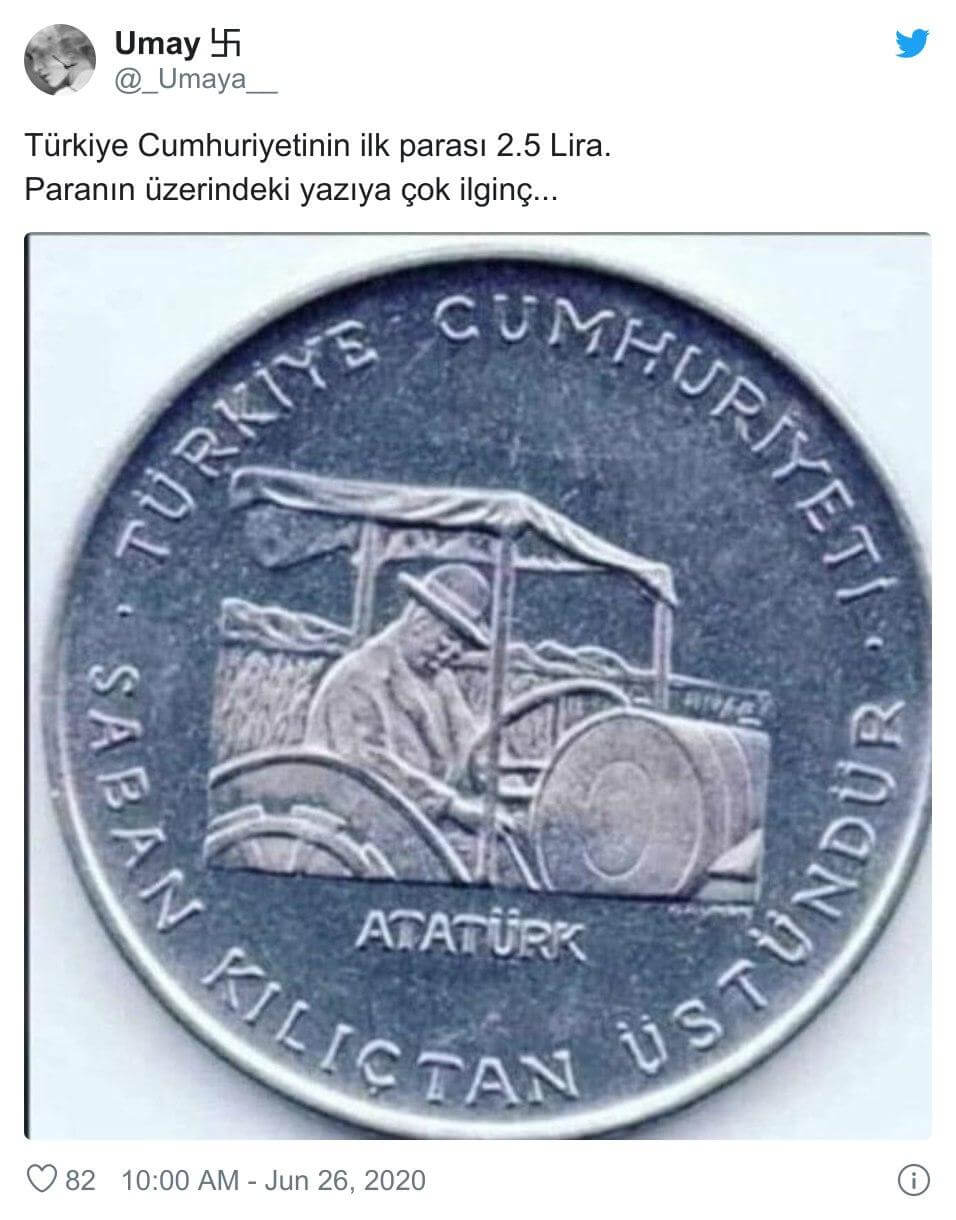 “Türkiye Cumhuriyetinin ilk parası 2.5 lira. Paranın üzerindeki yazıya dikkat: “Saban kılıçtan üstündür””