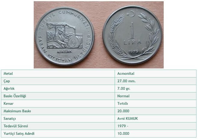 Stokların tükenmiş olması nedeniyle satıştan kaldırılan madeni paralar listesinde “saban kılıçtan üstündür” yazılı 2,5 kuruş, 5 kuruş, 10 kuruş, 50 kuruş, 1 lira, 5 lira, 150 lira şeklinde çıkarılan madeni hatıra paralar şu şekilde sıralanmaktadır: