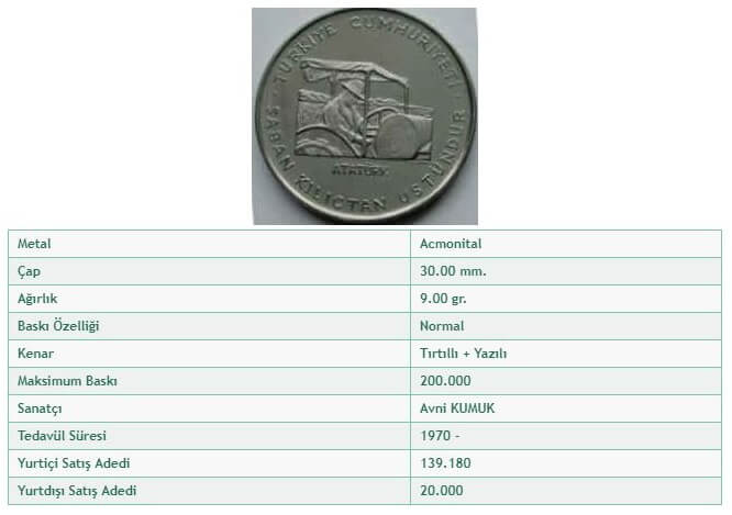 | 25 KURUŞ | 22,6 | 1,27 | 4 | Acmonital-52 | Tırtıllı-Yazılı | 1966 | 1989 |