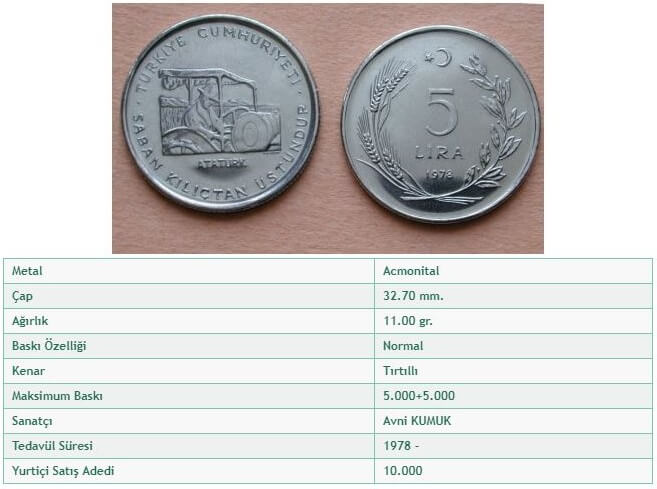 | 5 LİRA | 32,5 | 1,75 | 11 | Acmonital-52 | Tırtıllı | 1974 | 1982 |