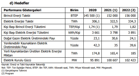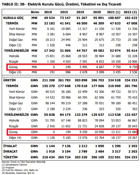 25 Ekim 2021 tarihli ve 31639 (mükerrer) sayılı Resmî Gazete’de yayımlanan 2022 Yılı Cumhurbaşkanlığı Yıllık Programı Türkiye’nin elektrik kurulu gücünün 2021 sonu itibarıyla 100 bin 607 megavata, 2022 sonunda ise 102 bin 423 megavata ulaşmasının, Güneş enerjisinde ise kurulu gücün 2021 sonu itibarıyla 7 bin 750 megavata, 2022’de sonunda ise 8 bin 750 megavata ulaşmasının planlandığı belirtilmişti.
