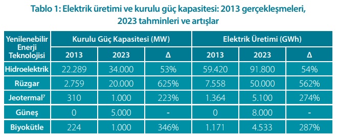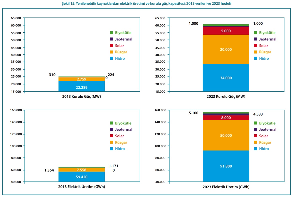 Enerji ve Tabii Kaynaklar Bakanlığı Yenilenebilir Enerji Genel Müdürlüğü, Avrupa İmar ve Kalkınma Bankası (EBRD), İspanya Krallığı Hükümeti ve Deloitte Touche & Tohmatsu işbirliğiyle 2015 yılında hazırlanan Türkiye Ulusal Yenilenebilir Enerji Eylem Planı, 2023 yılına kadar, yaklaşık 159 TWh elektrik üretebilecek (34.000 MW hidroelektrik, 20.000 MW rüzgar enerjisi, 1,000 MW jeotermal enerji, 5.000 MW güneş enerjisi ve 1.000 MW biyokütleden oluşan) 61.000 MW’lık yenilenebilir enerji kurulu güç kapasitesi oluşturulması hedefini içermekteydi.