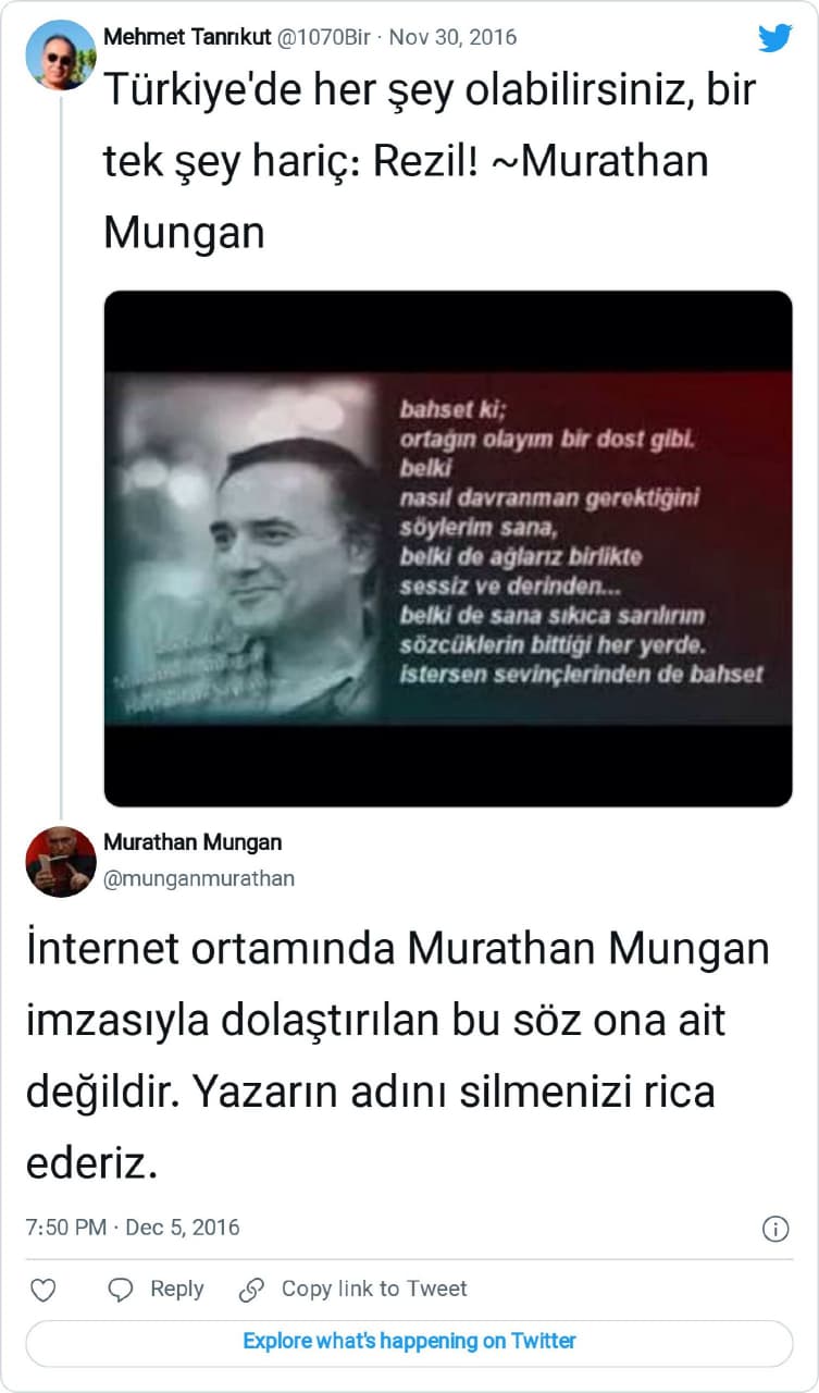 Murathan Mungan, bahse konu Twitter hesabının şahsına yanlışlıkla atfedilen sözlere dair uyarılarda bulunduğuna daha önce şöyle değinmişti: