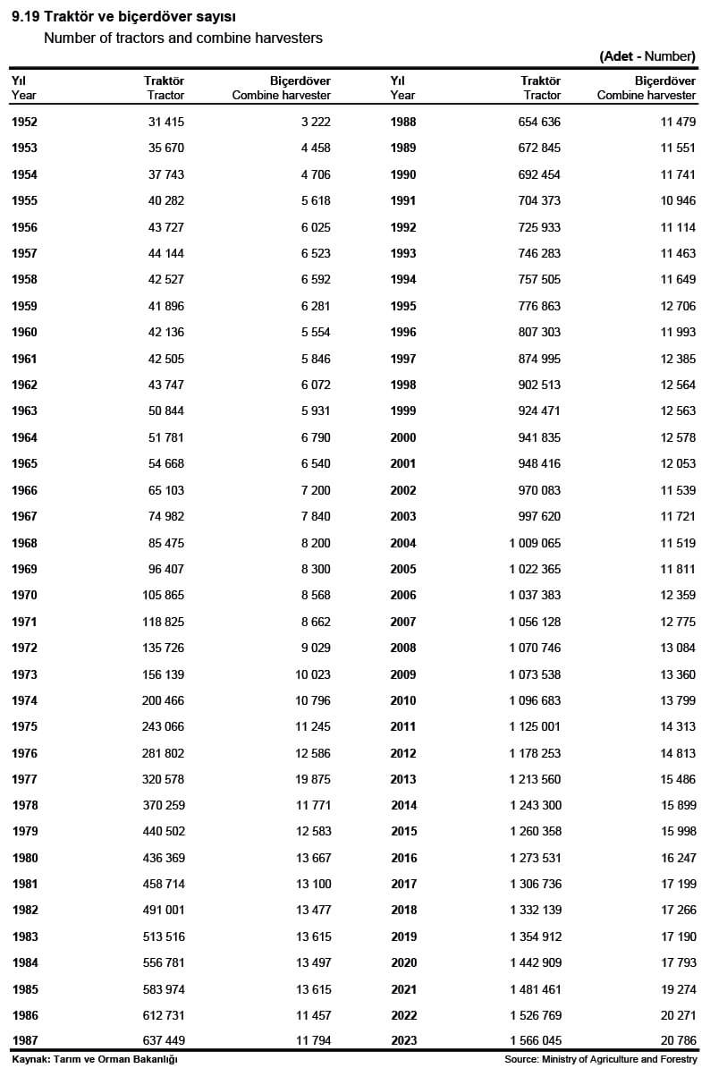 TÜİK tarafından hazırlanan 1923 yılından günümüze temel istatistiklerin bir arada sunulduğu “İstatistik Göstergeler 1923-2023” adlı yayında Türkiye’deki traktör sayısı 1952 yılından itibaren şöyle sunulmuş: