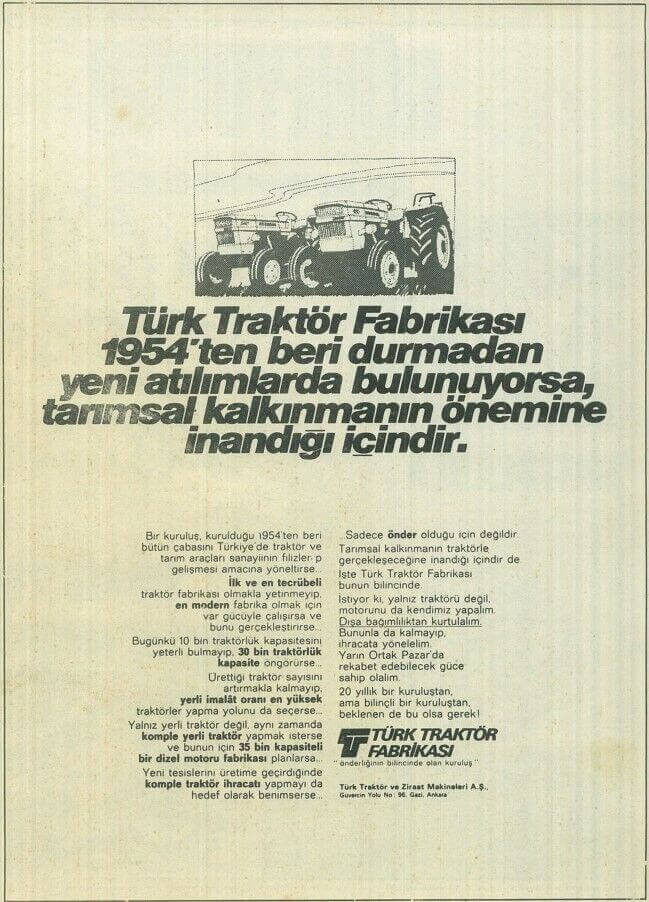 29 Temmuz 1954 tarihli Resmî Gazete’de yayımlanan 25 Haziran 1954 tarihli Bakanlar Kurulu Kararı ile Türkiye’nin ilk traktör fabrikasının temeli Etimesgut Uçak Motoru Fabrikası’nda atıldı.