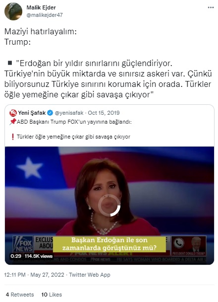 Trump: ‘Erdoğan bir yıldır sınırlarını güçlendiriyor. Türkiye’nin büyük miktarda ve sınırsız askeri var. Çünkü biliyorsunuz Türkiye sınırını korumak için orada. Türkler öğle yemeğine çıkar gibi savaşa çıkıyor'”