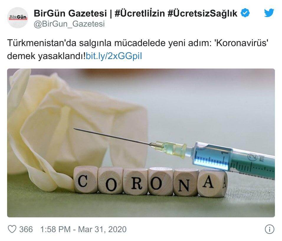 Birgün’ün Türkmenistan’da koronavirüs kelimesinin yasaklandığına dair haber paylaşımı