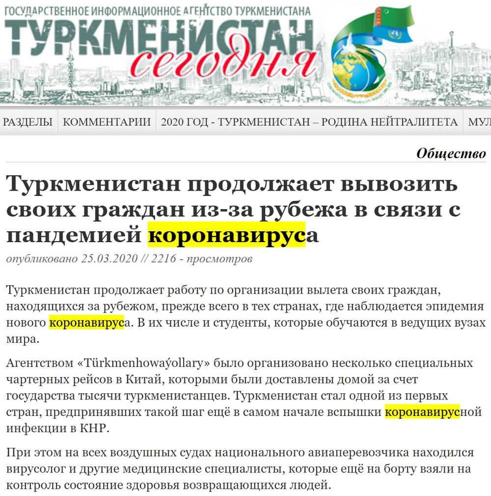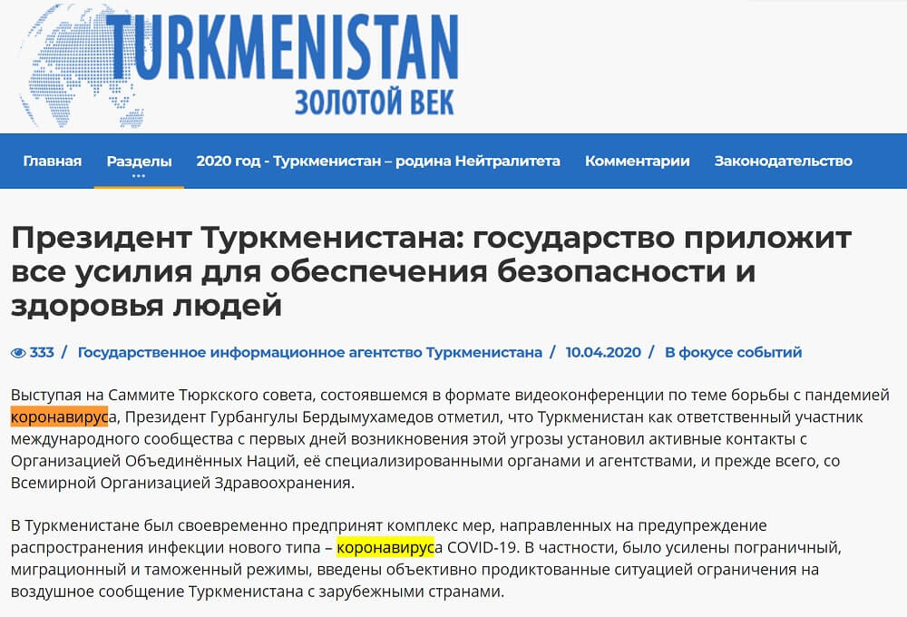 Türkmenistan’ın resmî haber ajansının internet sitesinde koronavirüs (коронавирус) atfının çeşitli sayfalarda geçtiği görülebiliyor