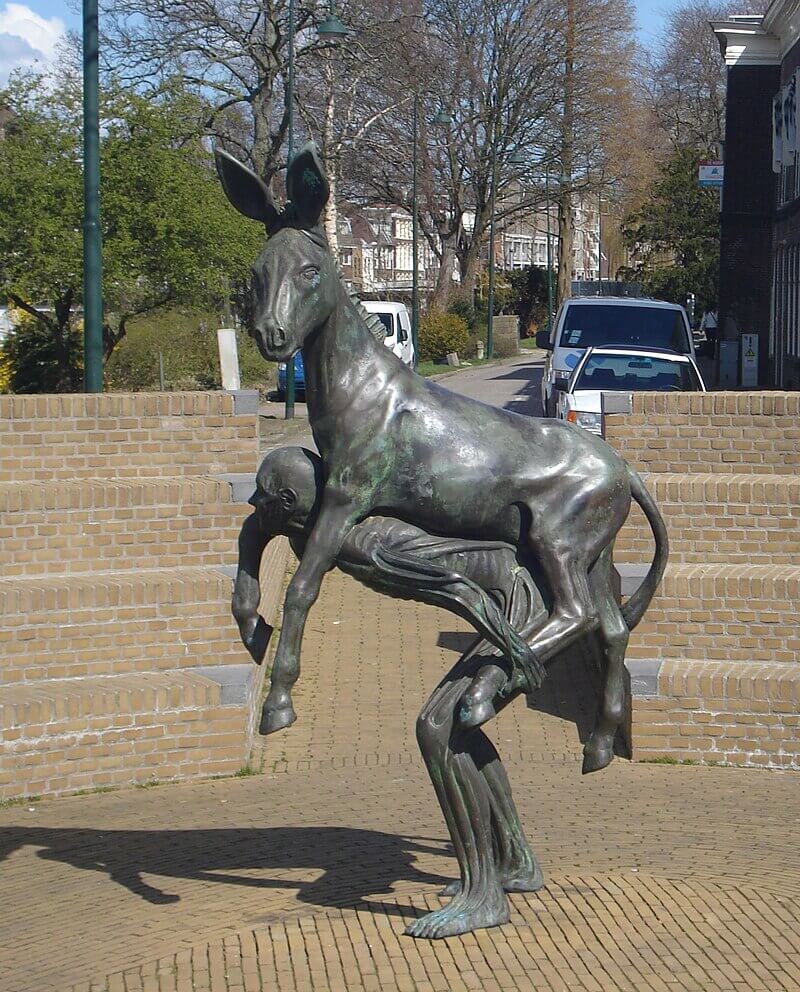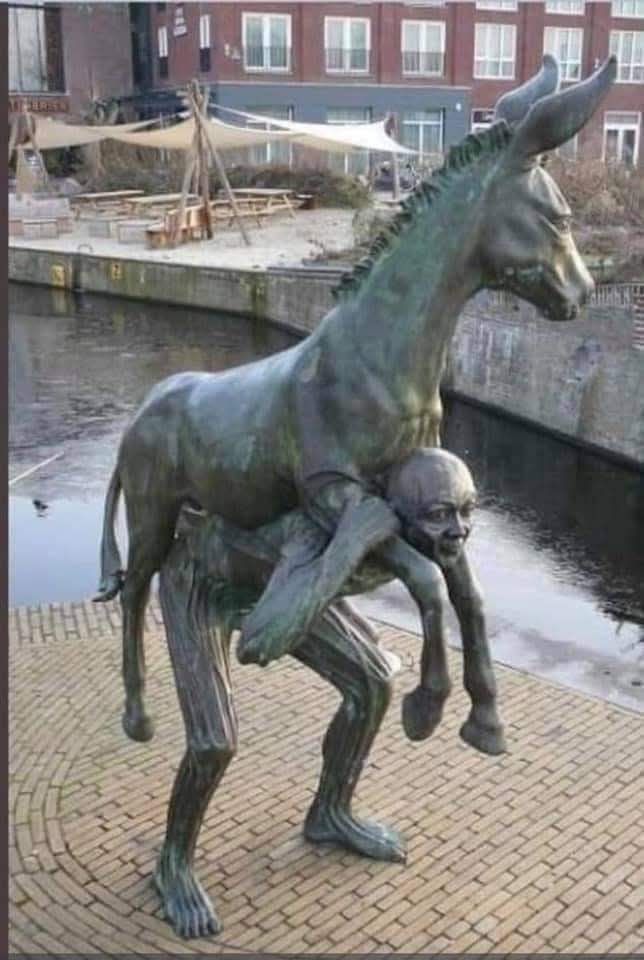 İLAVE: “Bunu yapan, İha Siha yapana gerici diyor” gibi ifadelerle paylaşılan “insana binen eşek” / “eşek taşıyan insan” heykeli Hollanda’nın Gouda kentinde yer alıyor. Jack Ass adı verilen söz konusu heykel Gijs Assmann tarafından 1998 yılında yapılmış.