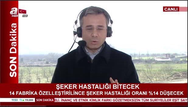 2018 yılı Ocak ayında Afrin’e düzenlenen Zeytin Dalı Harekâtı kapsamında TSK’nın Darmık Dağı’nı bombaladığına dair haber aktarımının yapıldığı 31 Ocak 2018 tarihli A Haber yayınından ekran görüntüsündeki “Darmık Dağı Bombalanıyor” alt bandı “Şeker Hastalığı Bitecek – 14 Fabrika Özelleştirilince Şeker Hastalığı Oranı %14 Düşecek” şekline montajlanmış.