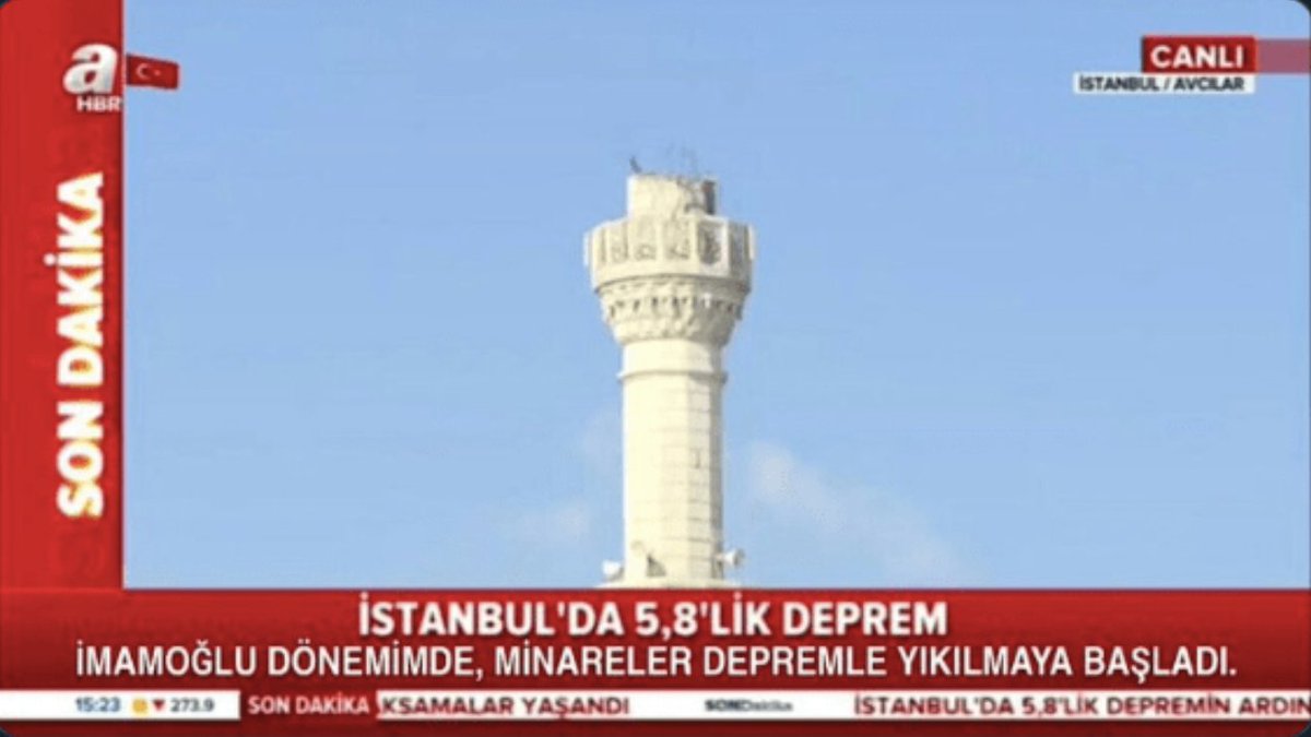 A Haber’in KJ bandı üzerine yapılan “İstanbul'da 5,8'lik Deprem - İmamoğlu döneminde minareler depremle yıkıldı" montajını içeren görsel