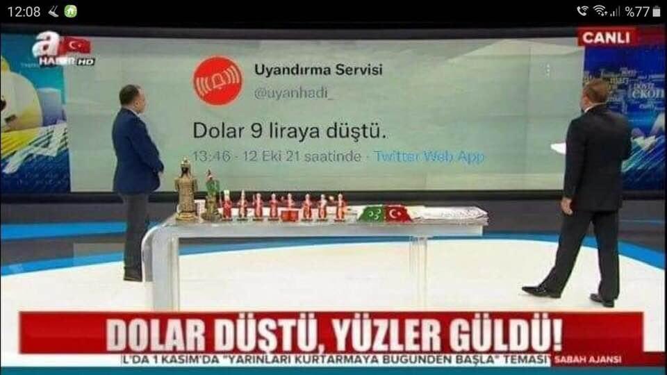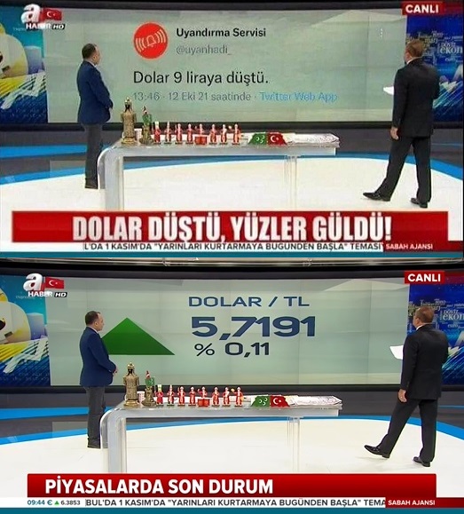 USD/TL kuru tarihi zirvesine çıktığı günlerde sosyal medyada paylaşılan A Haber’in “dolar düştü yüzler güldü” alt bandını ve “dolar 9 liraya düştü” tweetini kullanığı iddiasıyla paylaşılan ekran görüntüsü de montaj içeriyordu. Görüntünün orijinali Takvim Gazetesi Ekonomi Müdürü Faruk Erdem’in katıldığı 1 Kasım 2019 tarihli A Haber canlı yayınında “piyasalarda son durum” alt bandı ve “dolar/tl 5,7191” yansısını içeriyordu.