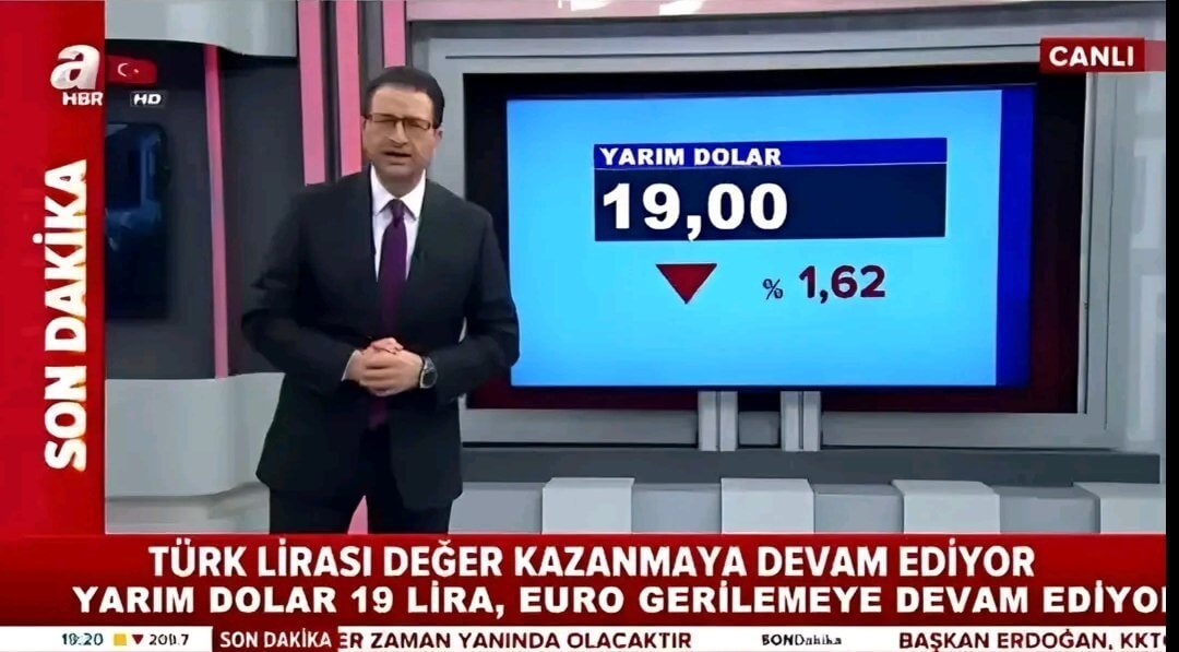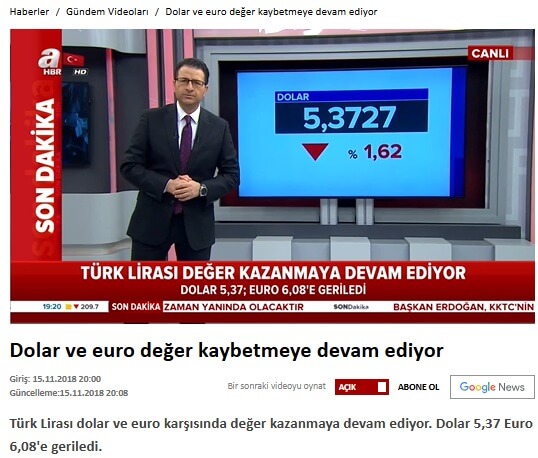 A Haber’in 15 Kasım 2018 günkü yayınındaki “Türk Lirası Değer Kazanmaya Devam Ediyor Dolar 5,37; Euro 6,08’e Geriledi” alt yazısı “Türk Lirası Değer Kazanmaya Devam Ediyor Yarım Dolar 19 Lira, Euro Gerilemeye Devam Ediyor” şekline çevrilmiş.