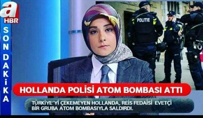 Eski Aile ve Sosyal Politikalar Bakanı Fatma Betül Sayan Kaya’nın 2017 yılı Mart ayında Hollanda’da “istenmeyen kişi” ilan edilmesini protesto eden göstericilere polisin atom bombası attığı şeklinde bir haberin A Haber’de yayımlandığı iddiasıyla paylaşılan görsel de dijital düzenleme içeriyor. A Haber’in “Hollanda polisi atom bombası attı” alt bandıyla yayınladığı bir habere rastlanamıyor. Anadolu Ajansı’ndan Büşra Akın’ın Haaretz Gazetesi yazarı Gideon Levy ile telefonla röportaj yaptığı görüntü üzerine “Hollanda Polisi Atom Bombası Attı” alt yazısı ve A Haber logosu eklenmiş. Aynı ekran görüntüsü daha önce farklı alt yazılarla da montajlanmıştı.
