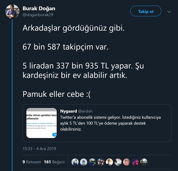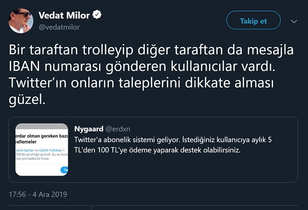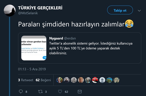 2019 yılı Aralık ayı başında sosyal medyada “Twitter’a abonelik sistemi geliyor. İstediğiniz kullanıcıya aylık 5 TL’den 100 TL’ye kadar ödeme yaparak destek olabileceksiniz” şeklinde bir iddia sosyal medyada çeşitli hesaplarca paylaşılmıştı.