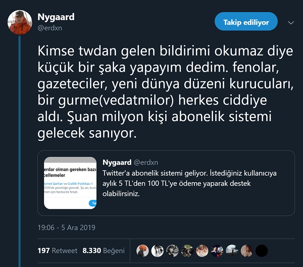 “Kimse twdan gelen bildirimi okumaz diye küçük bir şaka yapayım dedim. fenolar, gazeteciler, yeni dünya düzeni kurucuları, bir gurme(vedatmilor) herkes ciddiye aldı. Şuan milyon kişi abonelik sistemi gelecek sanıyor.”