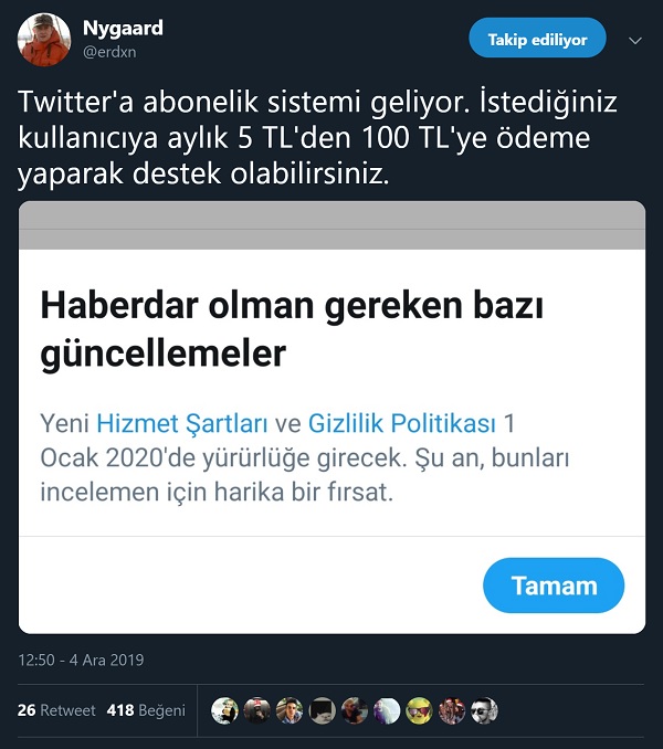 Ancak, Twitter’ın duyurduğu Yeni Hizmet Şartları ve Gizlilik Politikası incelendiğinde bahsedildiği gibi bir abonelik sistemi uygulamasının öngörülmediği anlaşılmaktadır. Twitter’ın “Hizmet Şartları ve Gizlilik Politikası“nda yapılacak güncellemenin 2020 yılı Ocak ayında yürürlüğe girmesi bekleniyor.