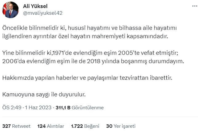 Yüksel, aile hayatını ilgilendiren ayrıntıların özel hayatın mahremiyeti kapsamında olduğunu, 1971’de evlendiği eşinin vefat etmesi sonrası 2006’da tekrar evlendiğini ve bu evliliğin de 2018 yılında bittiğini söyledi.