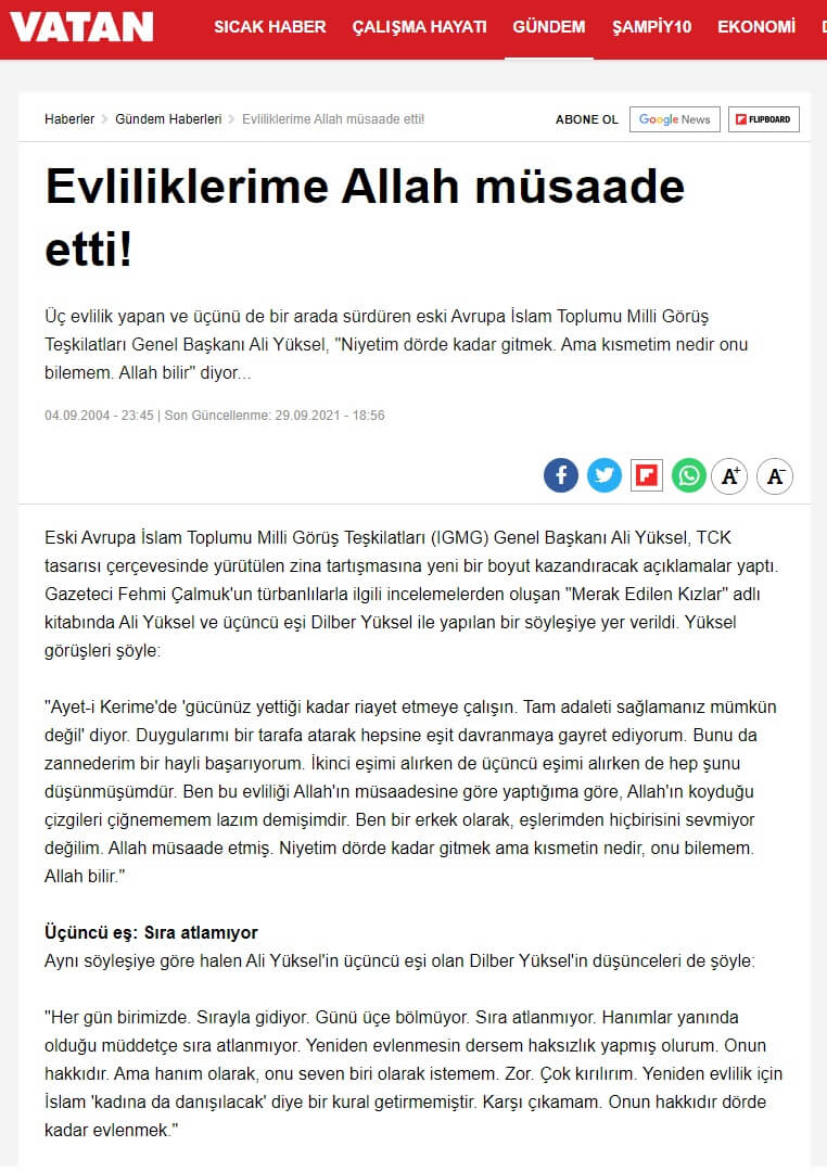 Şunu da söyleyeyim, benim üç evliliğimi dile getirip bunu kınayanlar, yadırgayanların kaç tanesi acaba sadece kendi eşi ile yetiniyor? O nikâhlı oldukları eşlerinin dışında hiçbir kadın ile yatıp kalkmadılar mı? Kadın ise erkek ile yatıp kalkmadılar mı? Herkes biliyor ki Türkiye’de nikâhlısının dışında gayrı meşru olarak yatıp kalkan ve sınır tanımayan bir sürü insan var. İmkânı olanlar bunu yaşıyorlar. Onlarla uğraşmıyorlar da niye benim Allah’ın emrine uygun olarak yaptığım evlilik ile uğraşıyorlar? Burada bunun temelinde kesinlikle İslam düşmanlığı var, din düşmanlığı var. Bunu kesinlikle söylüyorum. Ben buna isyan ediyorum. Ayrıca bir de tek evliliğe kadınları mecbur etme oyunu var. Kadın hürriyeti denen şey, temelinde erkeklerin oyunu. Ne kadar büyük bir kurnazlık. Ama bu işi öyle yapıyorlar, öyle perdeliyorlar ki sanki kadınlara hizmet ediyorlar. Kadınlar çok büyük bir oyun içinde.”