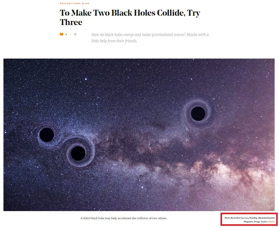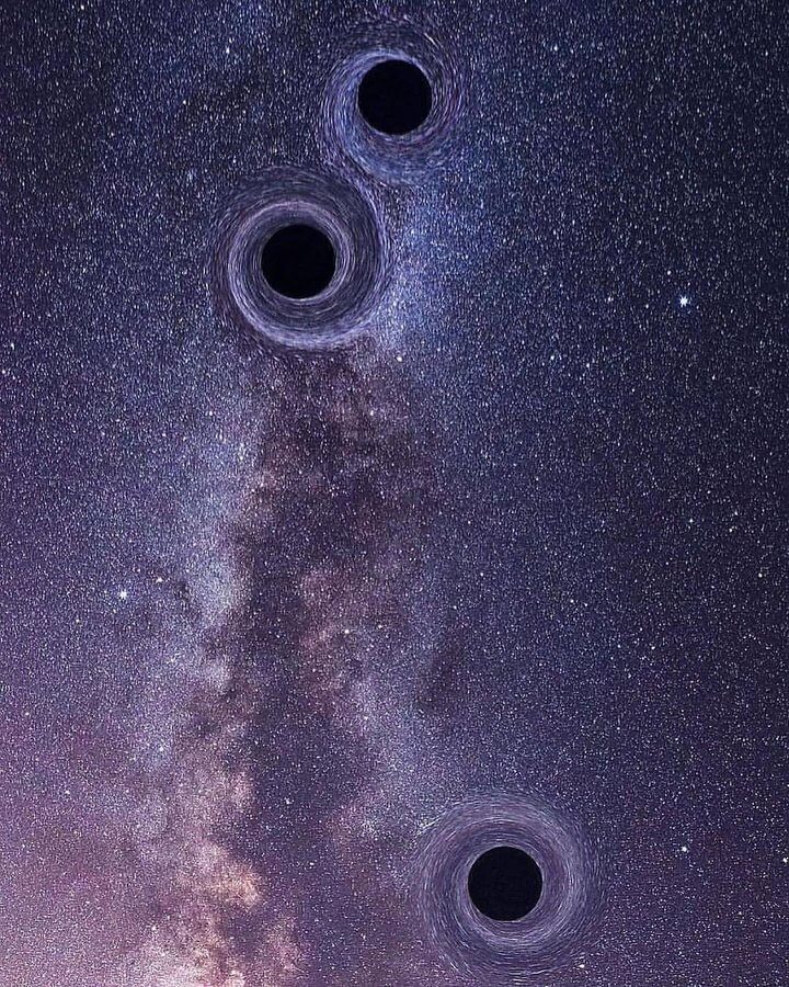 Uzay görüntüleme çalışmaları esnasında üç karadelik çarpışmak üzereyken kaydedilen gerçek bir görüntü sanılan görsel aslında Quanta Magazine için Lucy Reading-Ikkanda tarafından hazırlanan bir illüstrasyon.