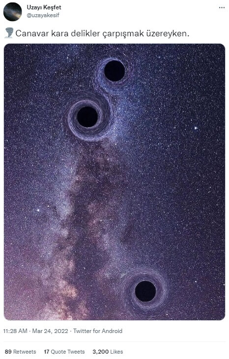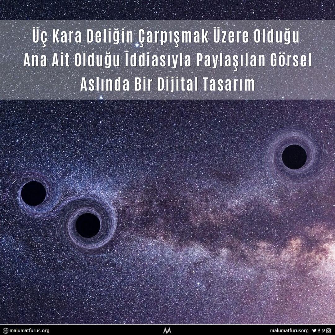 Çarpışmak üzere olan 3 karadeliğin görüntülendiği algısıyla aşağıdaki görselin “canavar kara delikler çarpışmak üzereyken” notuyla sosyal medyada paylaşıldığı görülüyor.