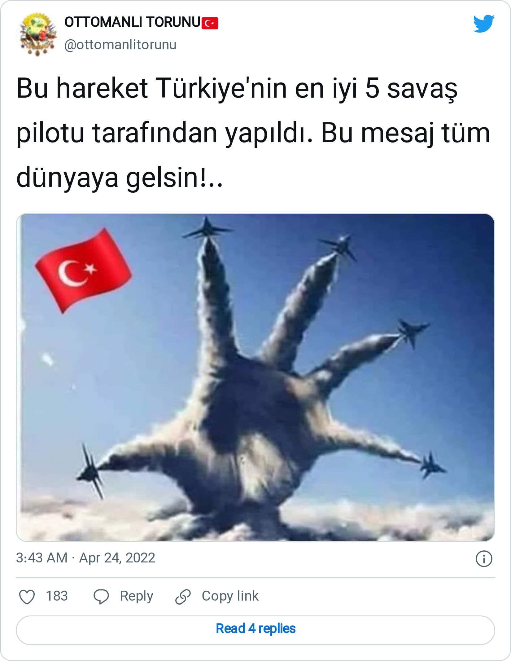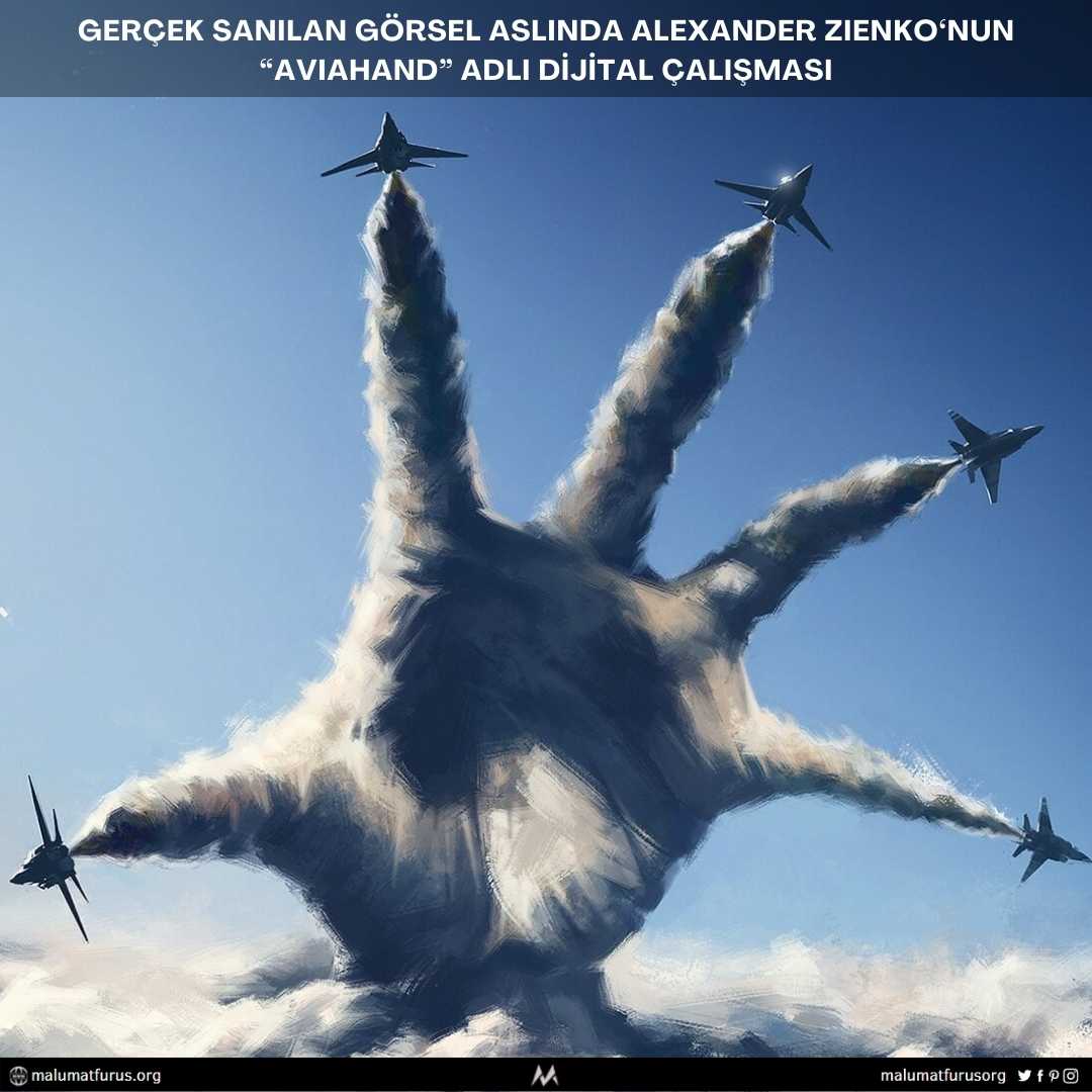 “Bu hareket Türkiye’nin en iyi 5 savaş pilotu tarafından yapıldı. Bu mesaj tüm dünyaya gelsin!” notuyla sosyal medyada paylaşılan 5 savaş uçağının pençe el hareketini yansıtan görsel aslında gerçek değil, Alexander Zienko‘nun “Aviahand” adlı dijital çalışması.