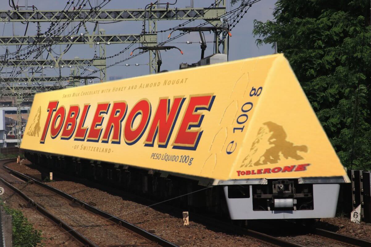 Aynı görsel üzerinde oynanarak bu defa treni üçgen prizmaya çevirmek yerine devasa bir Tobleron kutusu yerleştirilebilir…