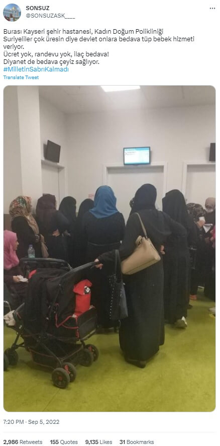 SONSUZ (@SONSUZASK____): “Burası Kayseri şehir hastanesi, Kadın Doğum Polikliniği Suriyeliler çok üresin diye devlet onlara bedava tüp bebek hizmeti veriyor. Ücret yok, randevu yok, ilaç bedava! Diyanet de bedava çeyiz sağlıyor.”