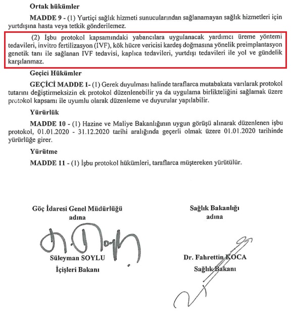 “İşbu protokol kapsamındaki yabancılara uygulanacak yardımcı üreme yöntemi tedavileri, invitro fertilizasyon (IVF), kök hücre verici kardeş doğmasına yönelik preimplantasyon genetik tanı ile sağlanan IVF tedavisi, kaplıca tedavileri, yurtdışı tedavileri ile yol ve gündelik karşılanmaz.”