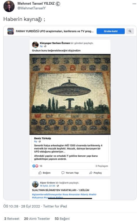 Söz konusu paylaşımın referans aldığı kaynak “UFO araştırma” temalı Facebook grubundaki bir gönderi.
