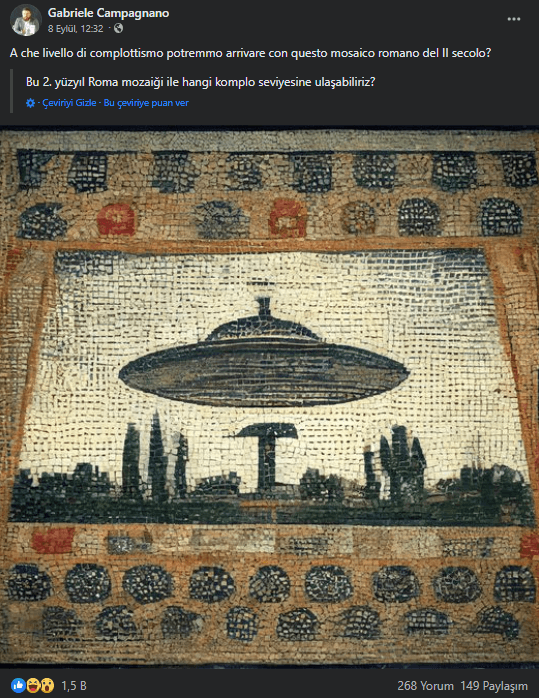 Görselin arka planını taradığımızda kaynak paylaşım olarak Gabriele Campagnano’nun profilindeki “Bu 2. yüzyıl Roma mozaiği ile hangi komplo seviyesine ulaşabiliriz?” notuyla yapılan aktarım çıkıyor.