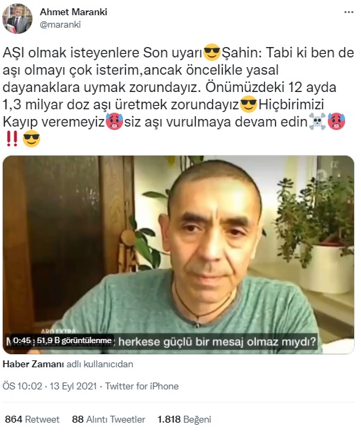 İLAVE: BioNTech sözcüsü Reuters’a verdiği demeçte Uğur Şahin’in 2021 yılının başında 2 doz aşı olduğunu, bahse konu kaydın daha önceye ait olduğunu, Şahin’in geçtiğimiz günlerde de hatırlatıcı doz aşısını olduğunu aktarmış.