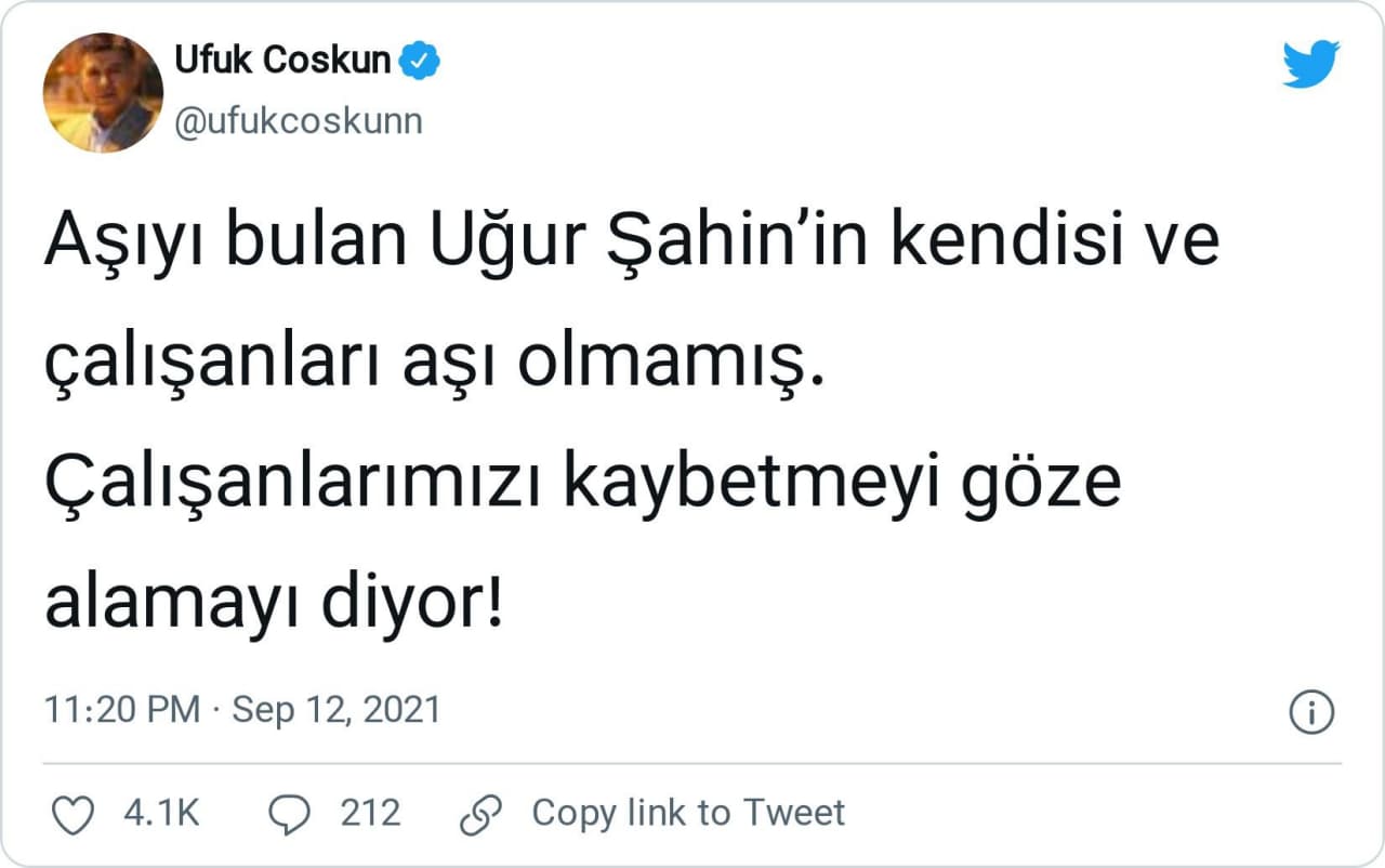 Şahin: Tabi ki ben de aşı olmayı çok isterim, ancak öncelikle yasal dayanaklara uymak zorundayız. Önümüzdeki 12 ayda 1,3 milyar doz aşı üretmek zorundayız.Bu süreçte hiç bir çalışanımızı kaybetmeyi göze alamayız.