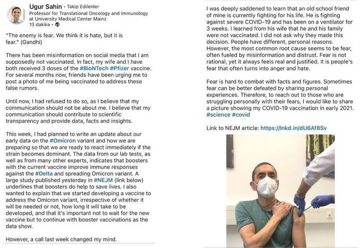 Uğur Şahin, LinkedIn hesabında 3 doz Covid-19 aşısı olduklarını belirterek aşı uygulaması esnasında kaydedilen fotoğrafını paylaşmış. LinkedIn’de paylaştığı metnin Türkçemize çevirisi şu şekilde sunulabilir: