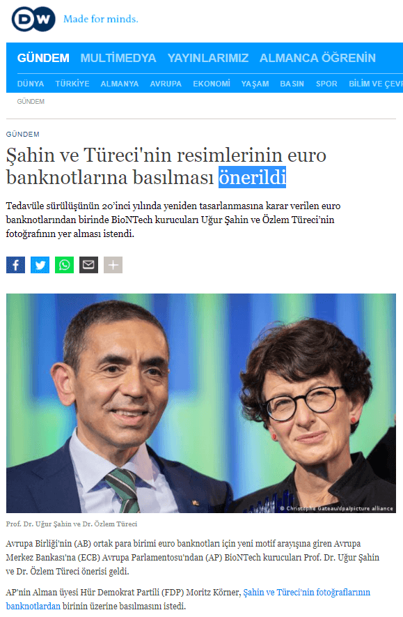 Aktarımın aksine, BioNTech kurucuları Özlem Türeci ve Uğur Şahin’in fotoğraflarının avro banknotlar üzerinde yer alması hususu henüz ÖNERİ aşamasında… Kararlaştırılmış, kesinleşmiş bir durum değil…