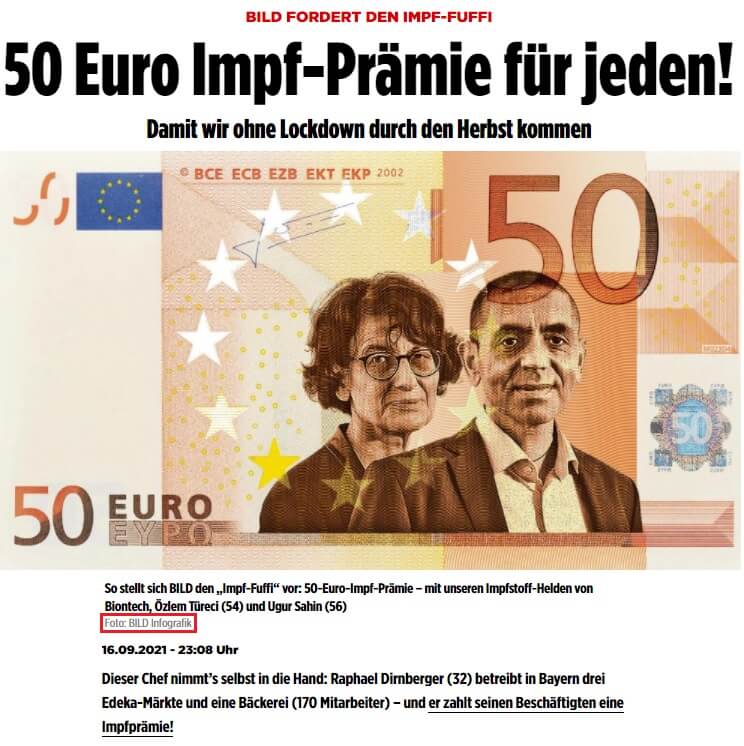 Bild, aşılanan vatandaşlara 50 avro verilmesi çağrısında bulunduğu 16 Eylül 2021 tarihli “BILD AŞI OLAYI IÇIN ÇAĞRIDA BULUNUYOR Herkese 50 Euro aşı bonusu! Karantina olmadan sonbaharı atlatabilmemiz için” (“BILD FORDERT DEN IMPF-FUFFI – 50 Euro Impf-Prämie für jeden! Damit wir ohne Lockdown durch den Herbst kommen“) başlıklı haberinde bu görsele yer vermişti.