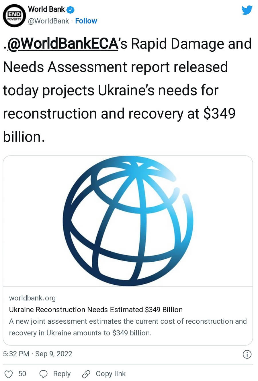 Raporun savaşın etkileri nedeniyle Ukrayna’nın yeniden inşası finansman ihtiyacının 349 milyar dolar civarında olduğu tahmini Dünya Bankası’nın sosyal medya hesaplarında da paylaşılmıştı: