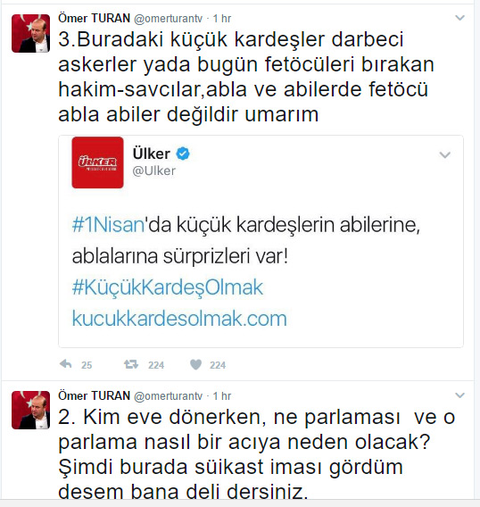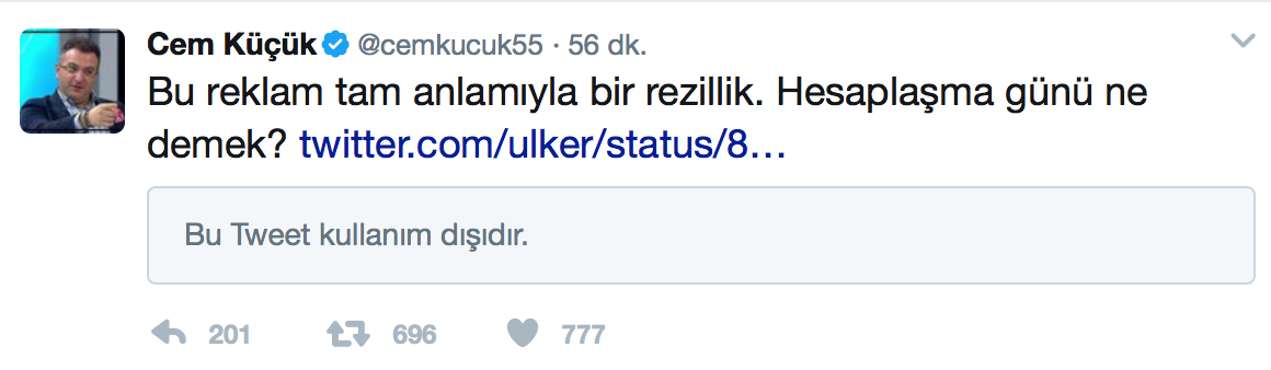 Peki ya bu olaylar nedeniyle benim başıma bir şey gelebilir miydi? Bakın dostlar… Ben altı üstü, “Bu reklam darbe mesajı veriyor olabilir, lütfen tetikte olalım.” gibisinden bir tweet attım ve birkaç tane de Twitter hesabını etiketledim. Bu kadar. Bu suç mudur? Elbette değildir.
