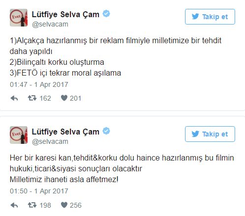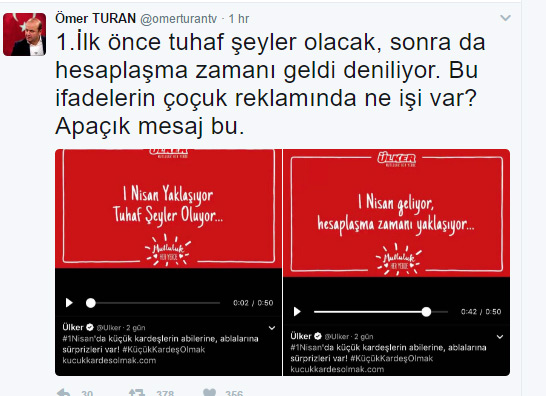 Acayip sözlerle, acayip görüntülerle ve bu bir komplo olarak yapılmış çünkü niye? Biz bunu takip ettik, bu reklam filmi yayınlanmış, televizyonda değil sosyal medyada, bizimle bir alakası yok bizim hesaplarımızdan yayınlanmıyor. Sonra bu ‘Ülker reklam filmi’ deniyor. Sonra bunu bir 150 kişi konuşuyor sonra birkaç yüzbin kişiye mal oluyor yani Twitter’da yani bu işin arkasında o bot denen robot denen şahsiyetler var, trol ordusu.